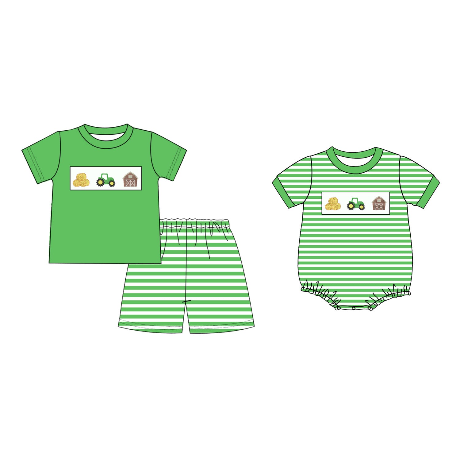 Boys Brother Summer Farm Embroidery Green Stripes Outfits