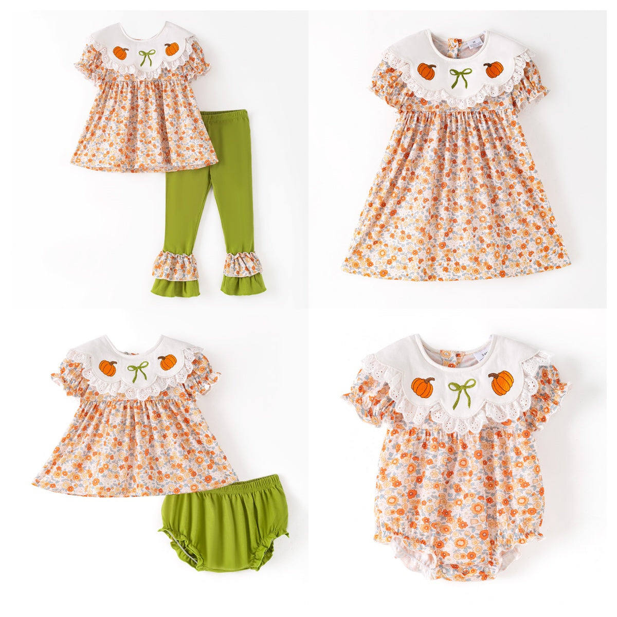 Thanksgiving Girls Smocked Outfit Set – Pumpkin Floral Embroidery Floral Sibling Collection