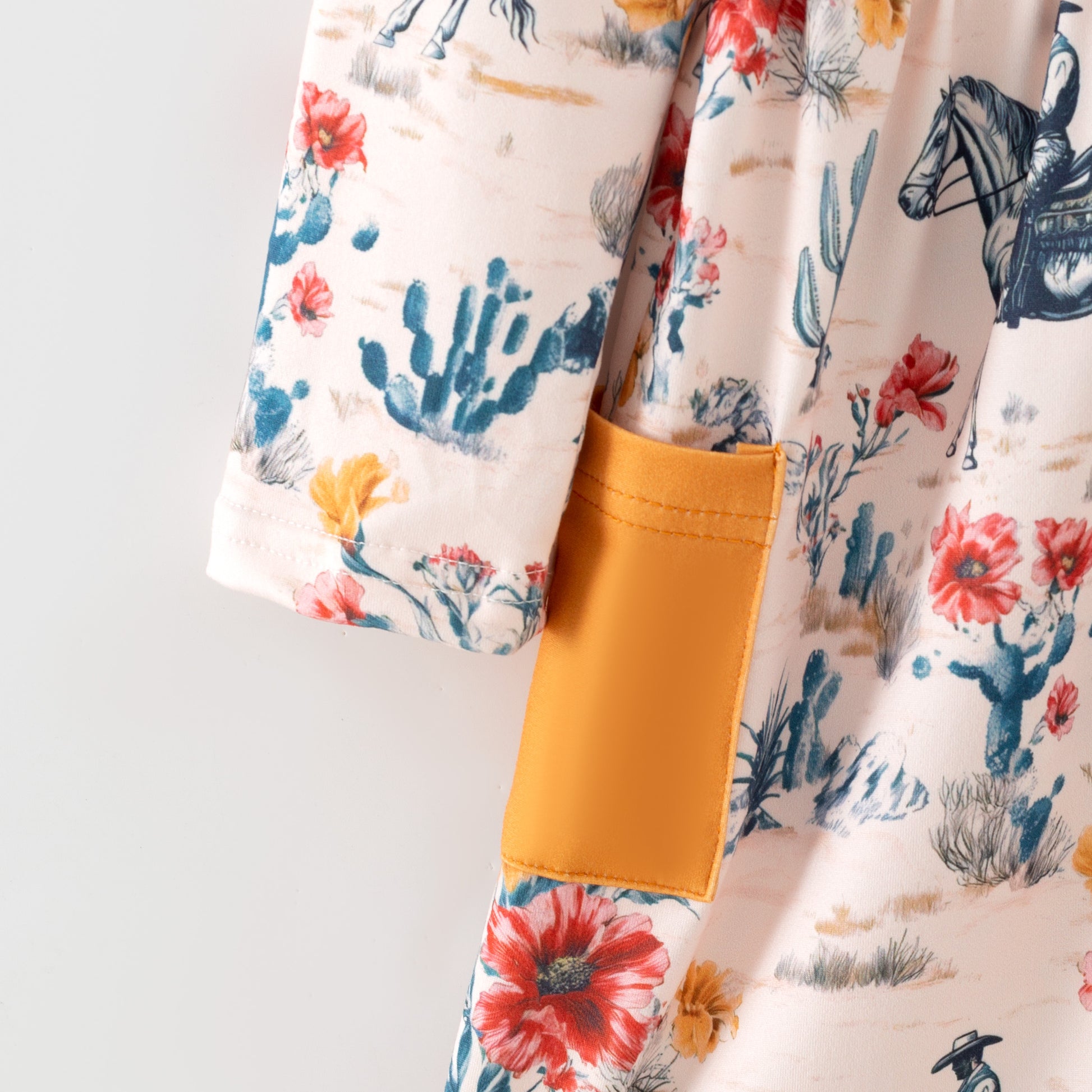 Bring charm and coziness to her fall wardrobe with this playful floral farm print dress. Featuring long sleeves to keep her snug on crisp autumn days, its vibrant pattern adds a touch of countryside whimsy perfect for any little adventurer. Soft and comfortable, this dress lets her twirl and explore with ease all season long.