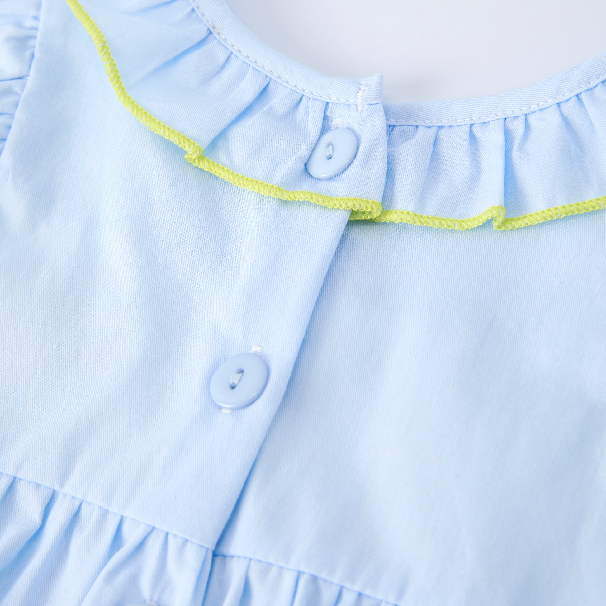 Hop into Easter fun with this adorable bubble romper! Featuring charming embroidered Easter bunnies and eggs with delicate smocking details, this playful blue piece is perfect for spring celebrations. The soft, comfortable bubble silhouette keeps little ones looking cute while staying active. Ideal for Easter photos, family gatherings, or everyday wear that brings festive cheer to any occasion.