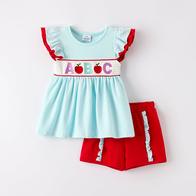 Delight your little scholar in this charming ABC Apple Embroidery Smocked Short Set! Perfect for back-to-school season, this playful outfit features adorable apple embroidery and smocked detailing that's as cute as it is comfortable. Watch her skip into the classroom with confidence in this sweet, education-themed ensemble that makes learning look stylish!