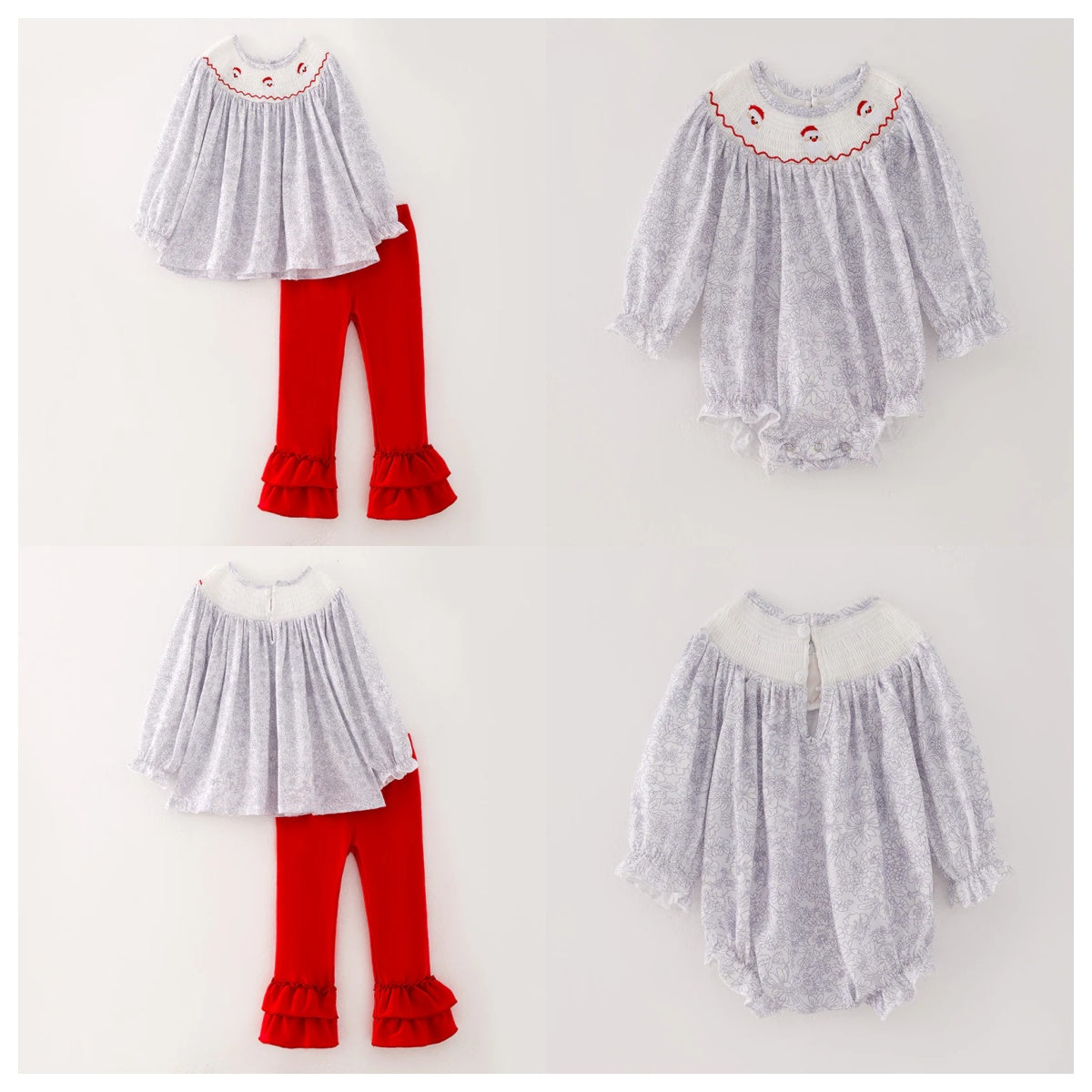 Girls Christmas Santa Embroidery Smocked Pant Set & Romper