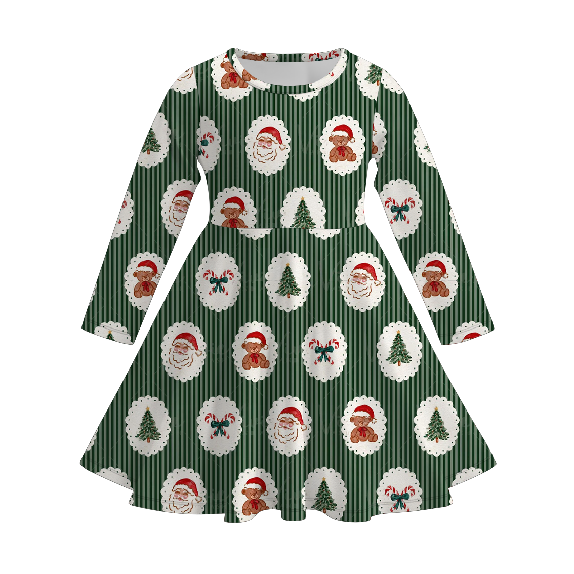 Girls Christmas Santa Tree Print Soft Long Sleeves Twirl Dress