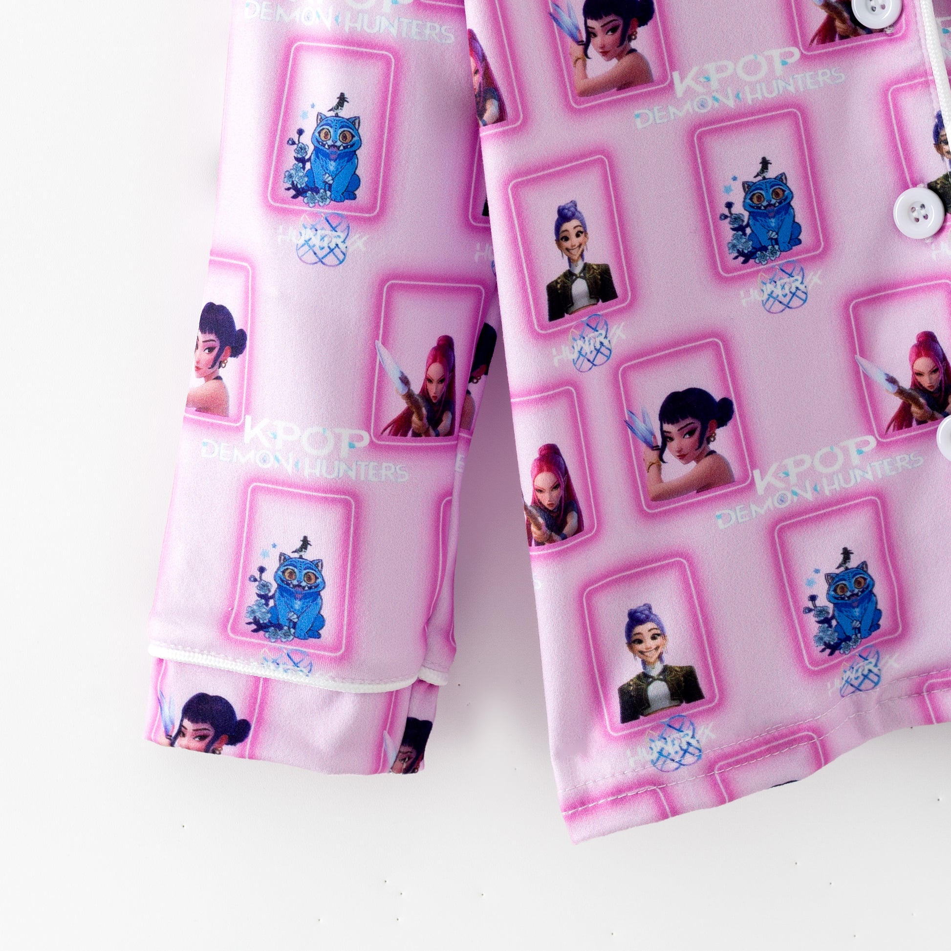 Cozy up in style with these adorable Girls Fall Kpop Demon Hunter Print Pajamas! Featuring a fun, eye-catching demon hunter graphic that blends K-pop vibes with playful attitude, this two-piece pant set is perfect for lounging, sleepovers, or bedtime comfort. Soft, breathable fabric keeps her comfortable all night long, while the trendy print makes getting ready for bed actually exciting. An ideal gift for K-pop fans and pajama lovers alike!