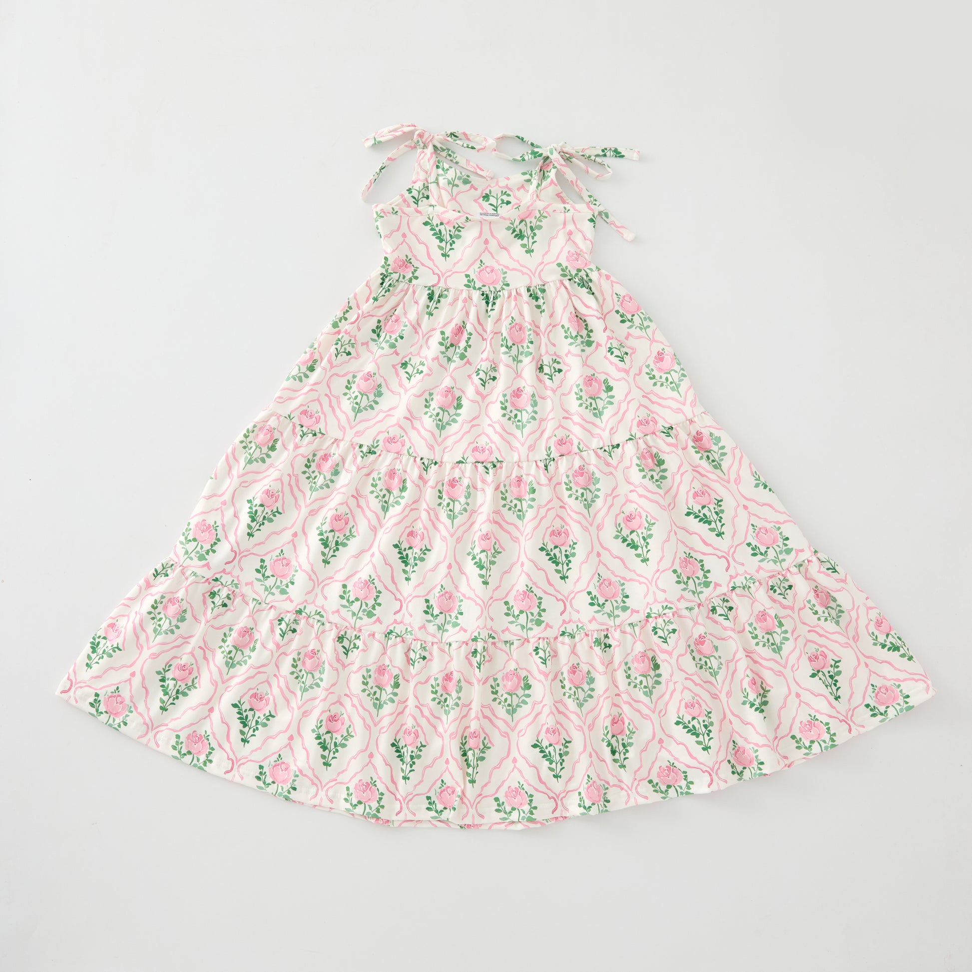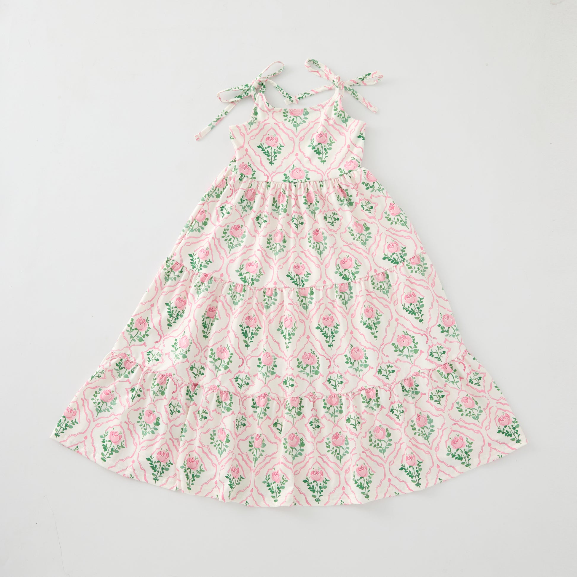Girls Pink Green White Floral Print Slip Pacthwork Maxi Dress