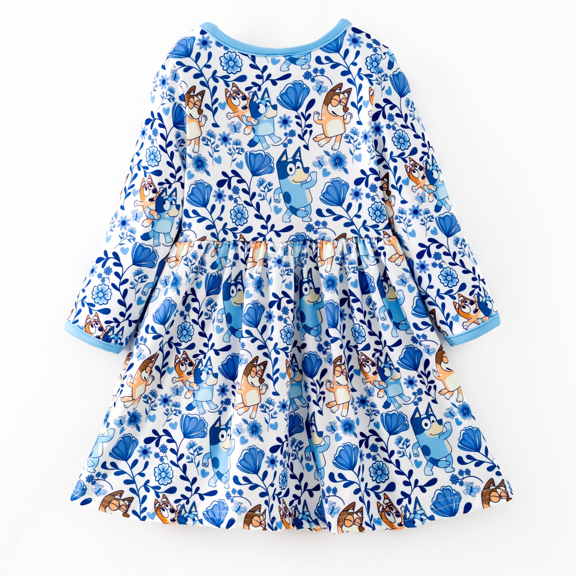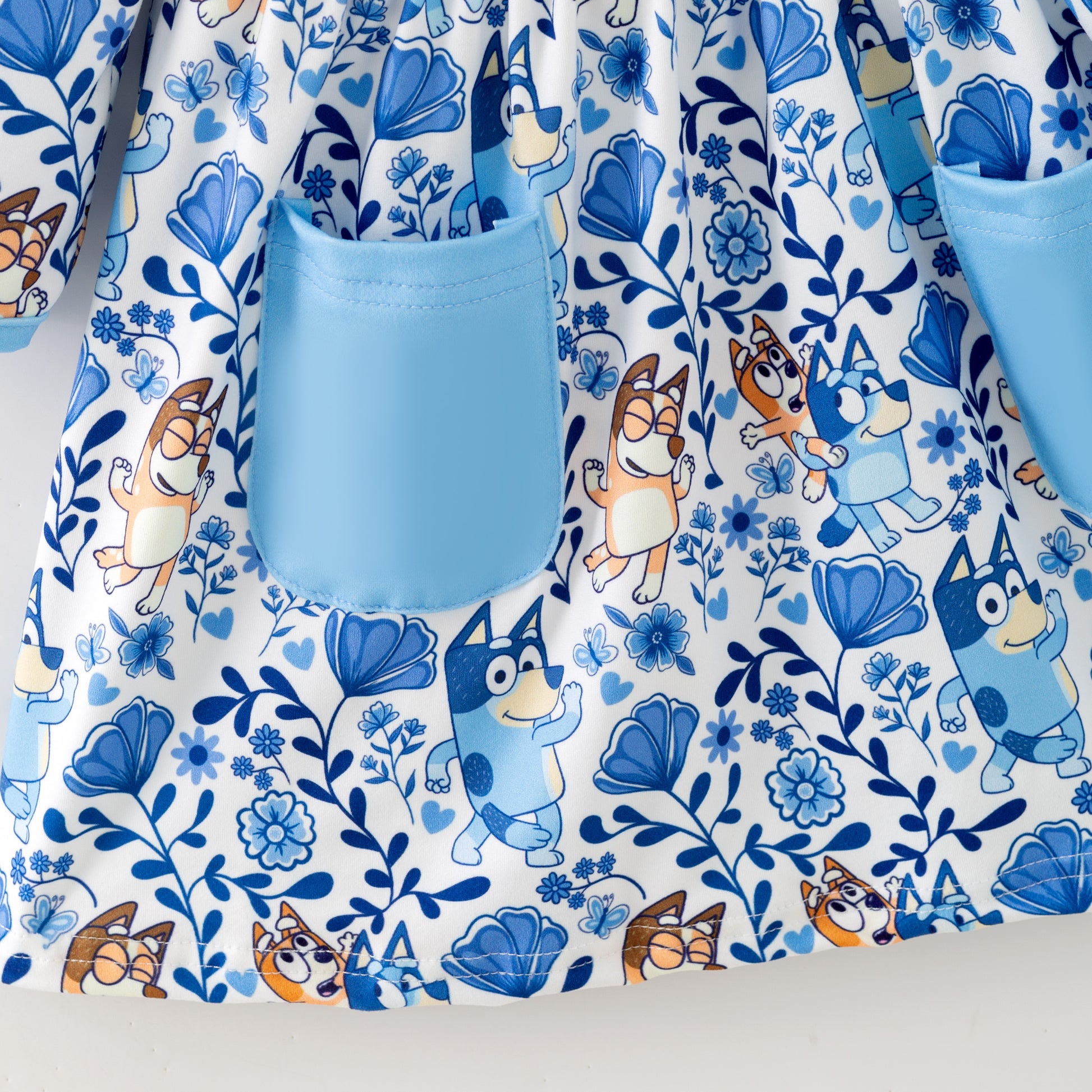 Girls Fall Bluey Cartoon Pocket Long Sleeves Twirl Dress