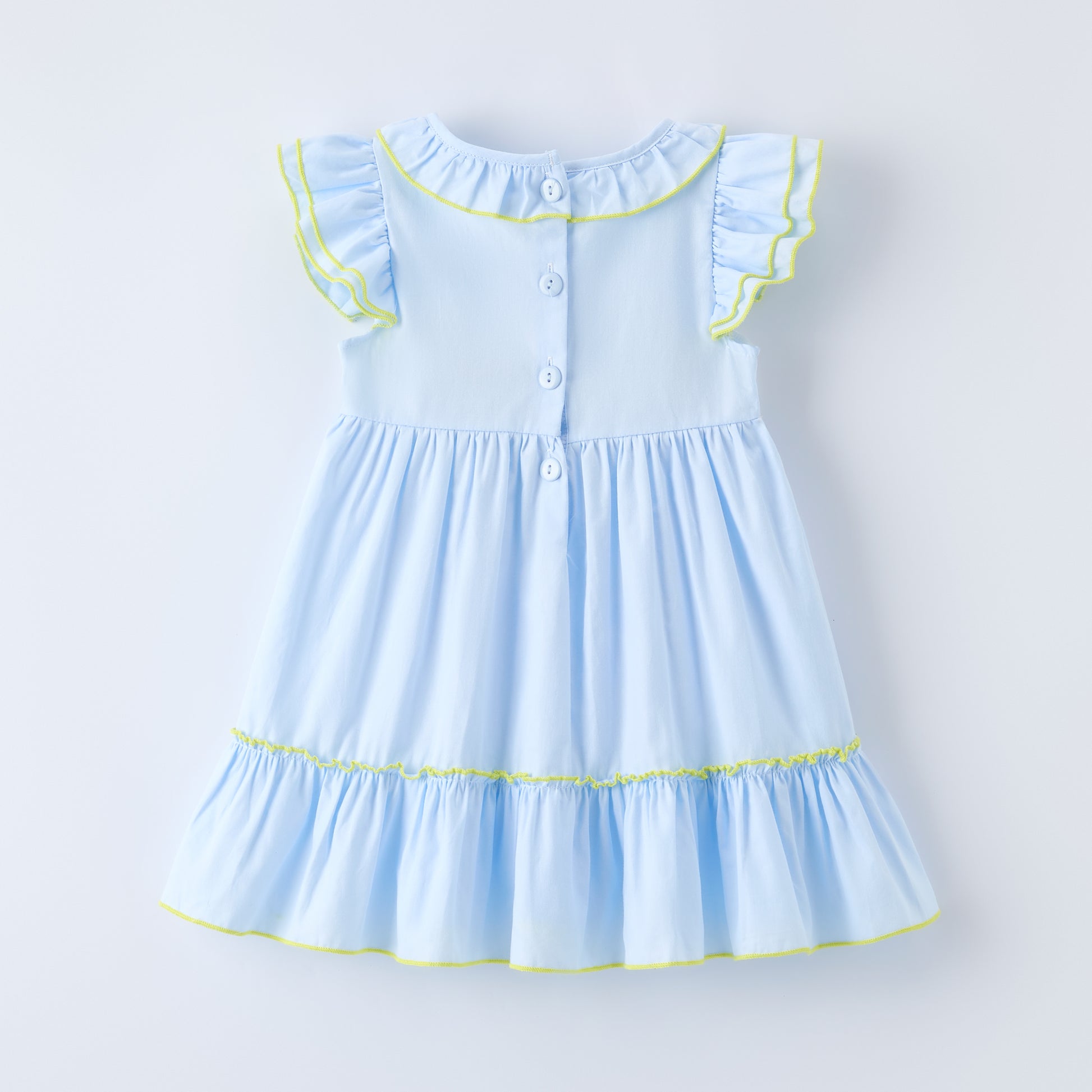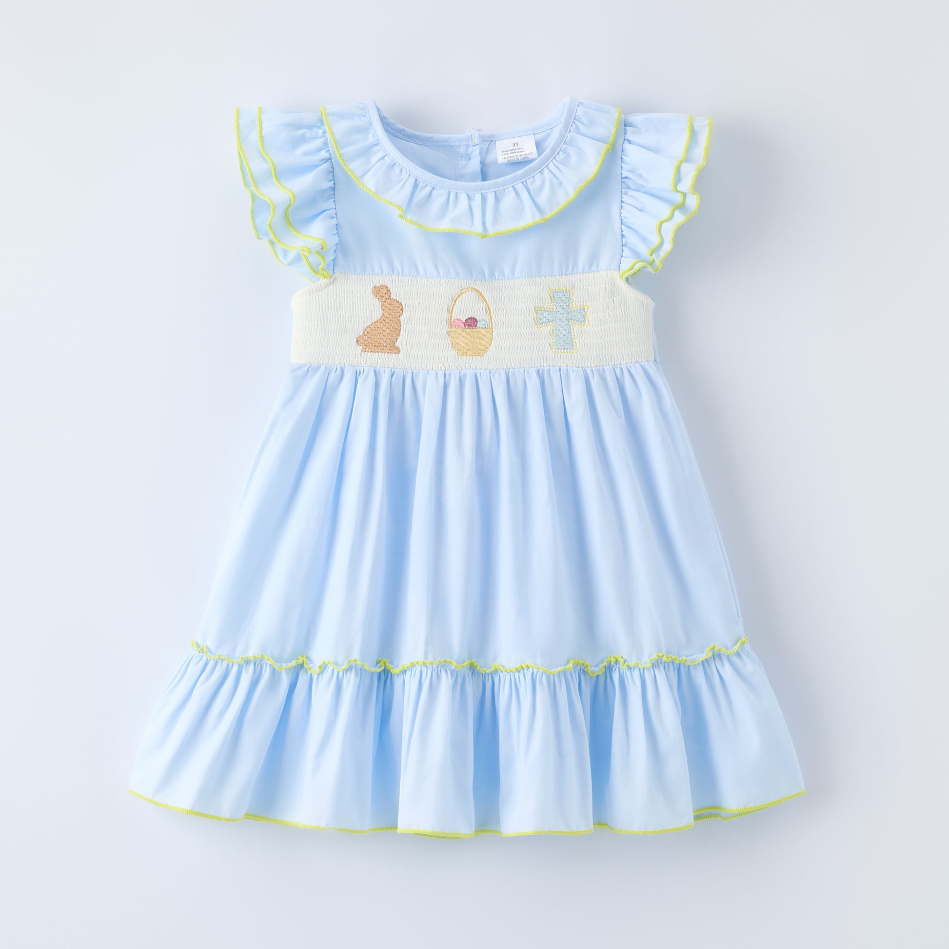 Hop into Easter fun with this charming blue dress featuring adorable bunny and egg embroidery details. The delicate smocked bodice adds vintage-inspired elegance, while the cross-stitch embellishments bring festive cheer. Perfect for Easter celebrations, spring photos, or special occasions, this dress combines comfort with whimsical style. The soft blue hue complements the intricate needlework beautifully, making it a standout piece in any little girl's wardrobe.
