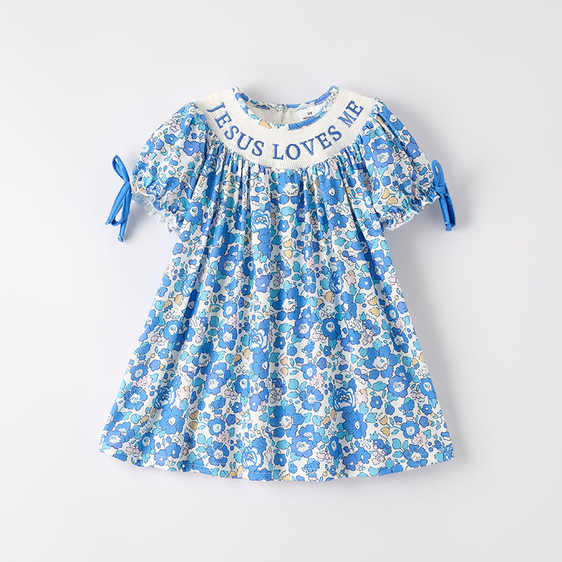 Girls Summer Blue Floral "JESUS LOVES ME" Smocked Dress