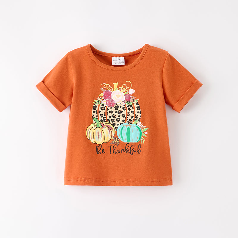Girls Thanksgiving Pumpkin BE THANKFUL Print Cotton Top