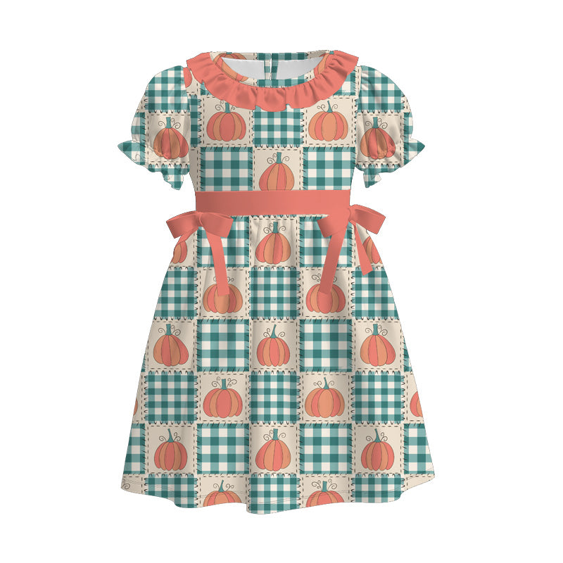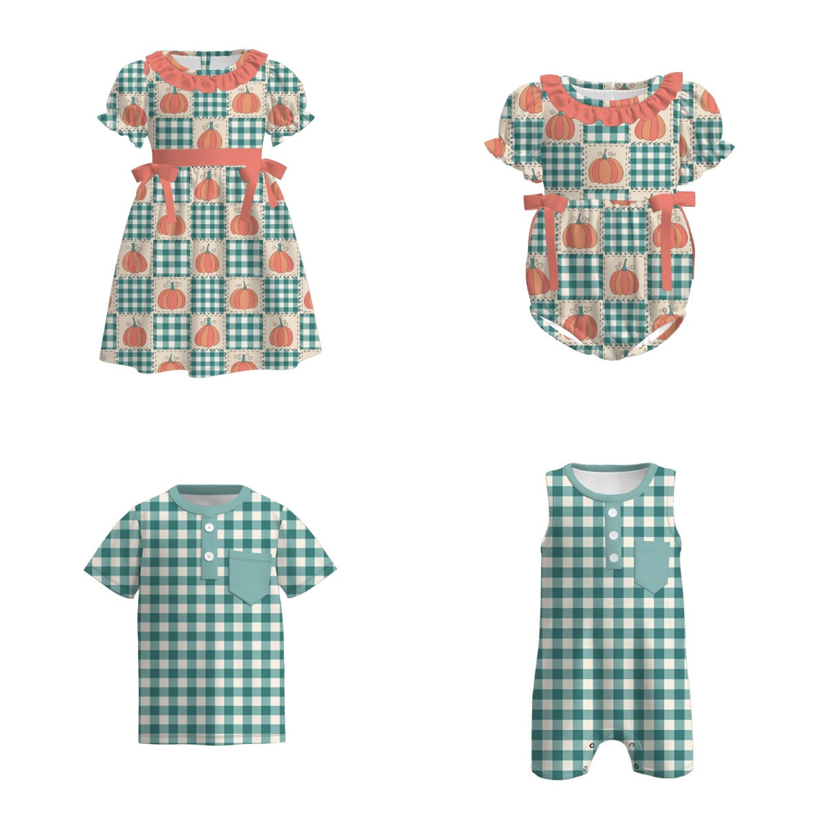 Kids Fall Autumn Green Pumpkin Plaid Dress Romper Top Sibling Clothes