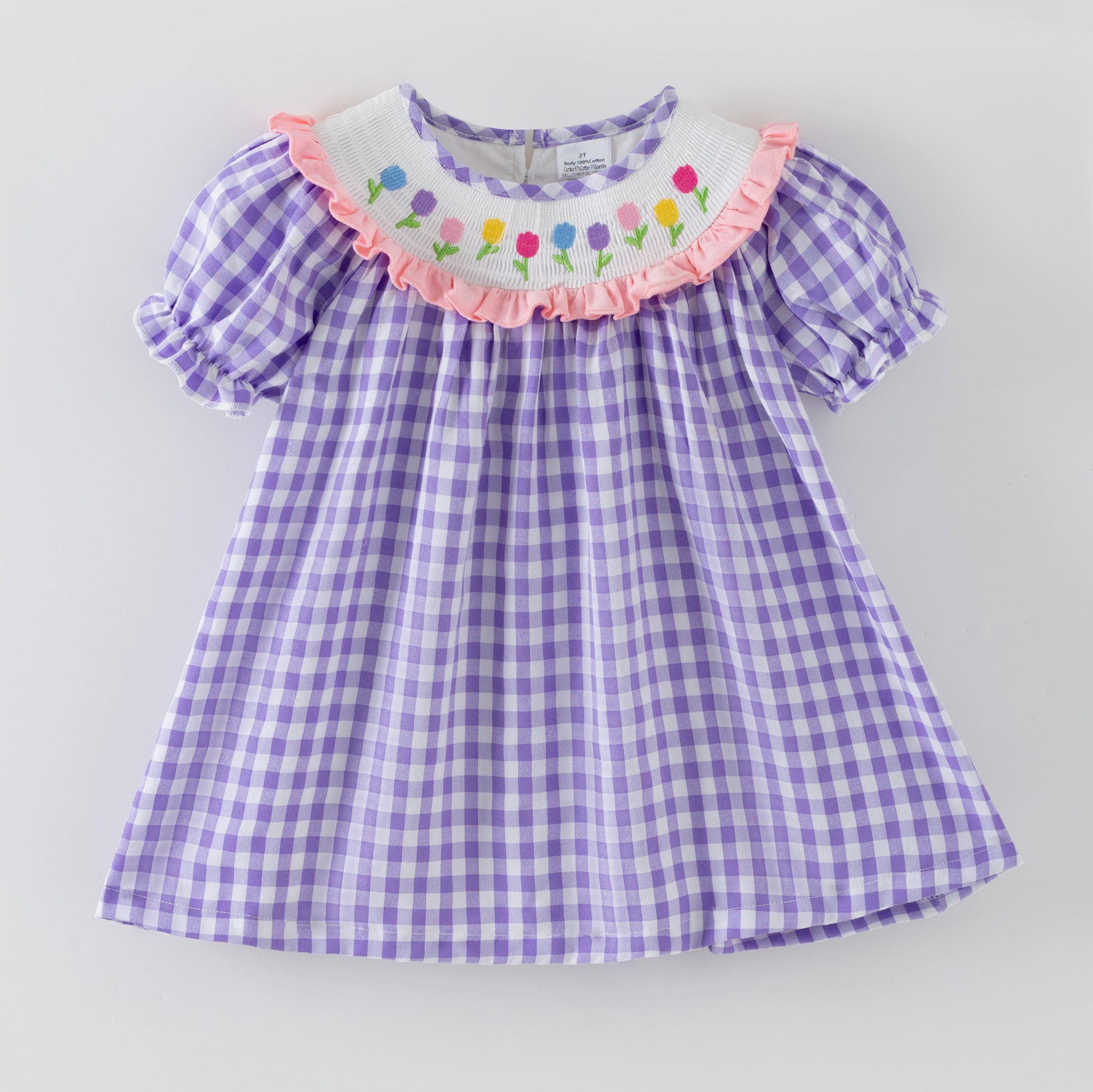 Spring Lavender Plaid Flower Embroidery Smock Dress
