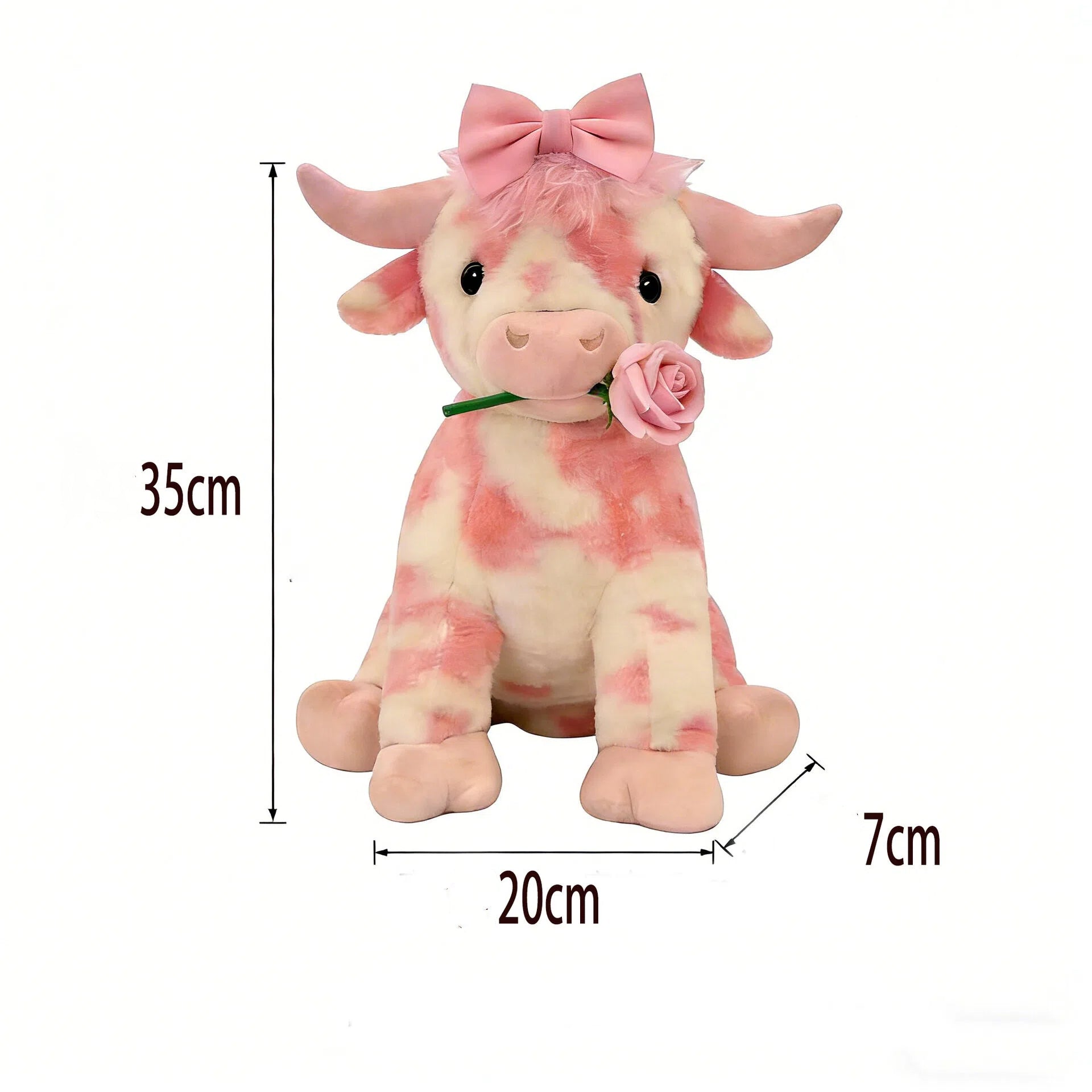 Adorable pink cow plush ready to spread Valentine's love! This cuddly companion features a charming bow, delicate rose detail, and a sweet heart design. Perfect for expressing affection to someone special or treating yourself to a cozy cuddle buddy. Soft, huggable, and bursting with romantic charm—the ideal gift for Valentine's Day or any occasion that calls for extra sweetness.